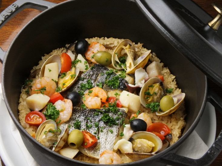 大きな釜の、ボリュームたっぷり当店特製「アクアパッツァ風ストウブ飯」はディナーの大人気メニュー。カニの出汁を十二分に染み込ませたご飯と、海の幸をふんだんに使った、魚介の旨みが存分にご堪能いただける一品です。釜の個数の関係で、食べられるかどうかはその日次第という限定品!お早目のご注文をお願いします。